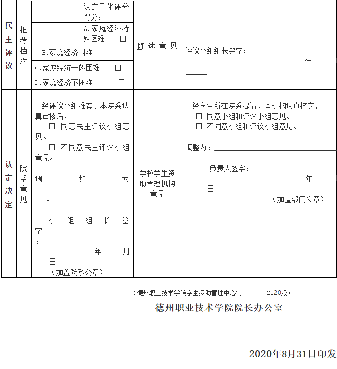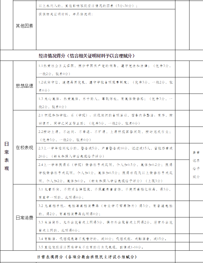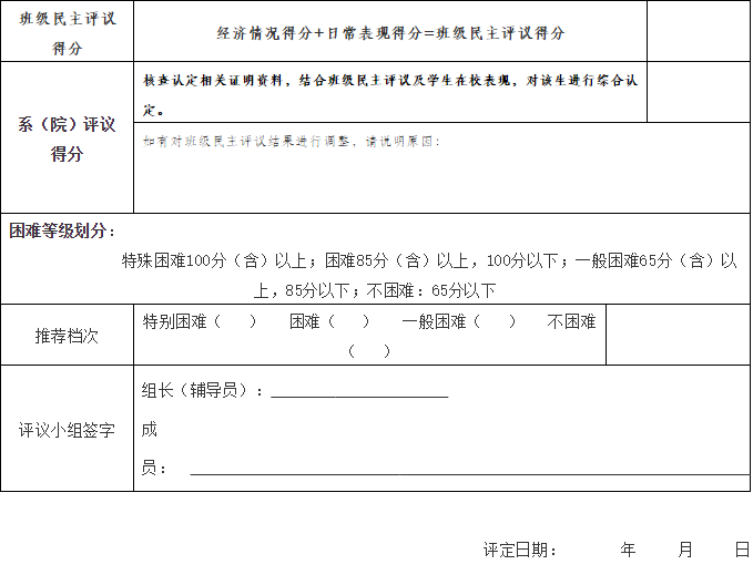 班级民主评议:班级民主评议小组根据学生提交的《家庭经济困难学生认定申请表》及相关证明材料,并结合学生日常消费,以及影响其家庭经济状况的有关情况,认真填写《家庭经济困难学生认定量化评分表》(附件2)《家庭经济困难学生等级认定表》(附件3),拟定本班级家庭经济困难学生。班级公示1天,无异议后,上报系(学院)认定小组。