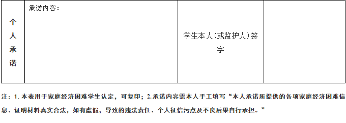 学校全面、认真部署每个学年的家庭经济困难学生认定工作。学校在向新生寄送录取通知书时,同时寄送《家庭经济困难学生认定申请表》(附件1);在每学年结束之前,向在校学生发送《家庭经济困难学生认定申请表》,并宣传国家资助政策。需要申请认定家庭经济困难的新生及在校学生,自愿、如实填写《家庭经济困难学生认定申请表》,并填写个人承诺,按要求签字。