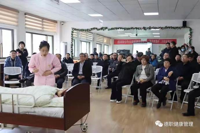 最后,刘斐斐老师介绍了beat365官网一年来的亮点工作和技能大赛取得的成绩,指导获得省“技能兴鲁”健康照护赛项二等奖的吕莲莲同学进行“协助偏瘫老人进行床上翻身训练”的演示汇报,现场观摩团的领导和老师们认真观看,跟随汇报的同学一起模拟,大家表示这样贴近生活实际的技能非常有推广的价值。