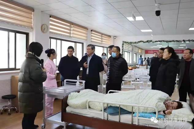 范轶同志首先就beat365会员官方网站筹建两年来建设的基本情况情况进行简单介绍。介绍了为构建以“尊”“敬”为核心的“尊老、敬业、专技、守诚”的专业育人体系打造的迎宾墙和誓言墙。随后范轶重点介绍了刚刚建成的校内“智慧康养理训一体室”和校外产教融合实训室。“智慧康养理训一体室”建筑面积140平方米,可满足48名学生同时上课,实现项目化教学的需求。目前,前期基础建设项目已完成,将承担智慧养老、健康管理和健康大数据专业《智慧为老平台运行管理》、《人体结构与功能》、《流行病学》等课程的理论教学任务。待整个项目完成,还可以承担学生开展呼吸系统、消化系统、运动系统等人体结构认知的实操训练任务。