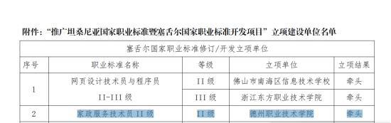 近日,中非职业教育联盟下发了《关于开展“推广坦桑尼亚国家职业标准暨塞舌尔国家职业标准开发项目”立项建设单位遴选工作的通知》,beat365会员官方网站积极申报的家政服务技术员 II 级职业标准立项成功,beat365官网成为塞舌尔国家职业标准修订/开发立项单位。