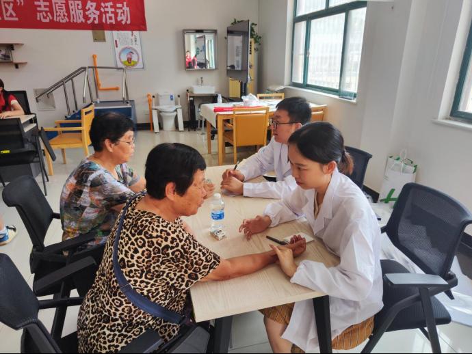 随后,吴双老师带领学生志愿者们为老人们量血压、测血糖,为“三高”症状的老人给予注意饮食、合理作息、遵照医嘱,正确服药的提醒。“阿姨,您的血压是正常的,但餐后两小时血糖偏高,注意日常控制饮食,饭后进行适当的运动。”吴双老师耐心地对社区老人说,并给出个体化健康建议。
