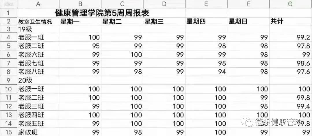 此次各班级卫生检查分数量化表: