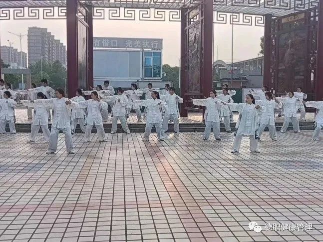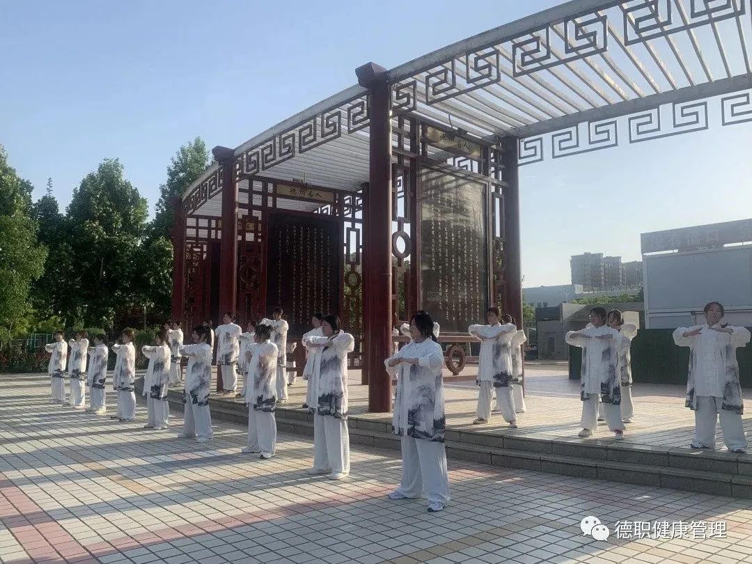 伴随着悠扬舒缓的音乐,“上托、下落、搭腕、开弓……”,一招一式,动作舒展,动静相兼,刚柔并济,意动形随,共同演绎了八段锦的自然与和谐之美。
