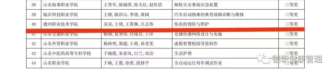 近日,由山东省教育厅主办的2023年山东省职业院校教学能力大赛拟获奖团队名单公布,吴双、王倩、王霄琳、吕志伟老师的参赛作品《坠床的预防与照护》获山东省职业院校教学能力大赛(高职组)专业课程二组三等奖,本次大赛是对学院教师教学能力的实战检验,同时彰显了beat365官网年轻教师的精神风貌。