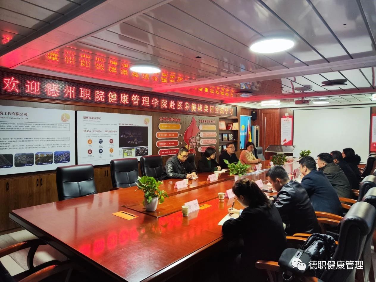随后校企双方进行了座谈,付存辉副总经理、江疆副总经理分别介绍了德州市医养健康有限公司的基本情况和相关业务开展情况。同时,表示在校企合作模式、实训基地建设、培训工作等方面进行深度合作。