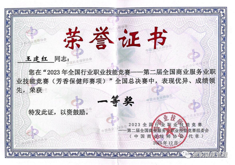 芳香保健师赛项总决赛由中国商业技师协会、中国就业培训技术指导中心、中国财贸轻纺烟草工会全国委员会联合主办,河北雄安新区公共服务局、北京市成人按摩职业技能培训学校共同承办的,来自全国22个赛区230名选手同台竞技,王建红老师赛前积极备赛,赛场沉着应战,经过近2天的激烈比拼,最终获得全国第五名,一等奖的好成绩。