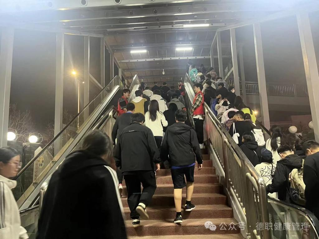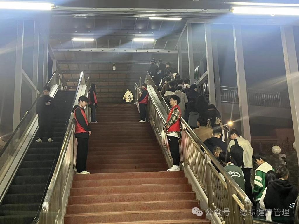 活动中,志愿者们认真履行自己的职责,合理分工,坚守岗位。天桥执勤志愿者们在负责人的带领下进行分工,分别站在天桥的不同位置引导同学们快速通过楼梯,劝导并纠正同学们不文明的交通行为,禁止逆行楼梯,上下楼梯逗留和打闹等行为,以免发生道路拥堵和踩踏事件。志愿者们各司其职,在大家的共同努力下,同学们快速通过天桥,避免了人员拥堵踩踏事件的发生。