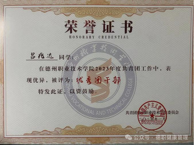 2024年1月,在2023年度共青团工作中,被评为“优秀团干部”;