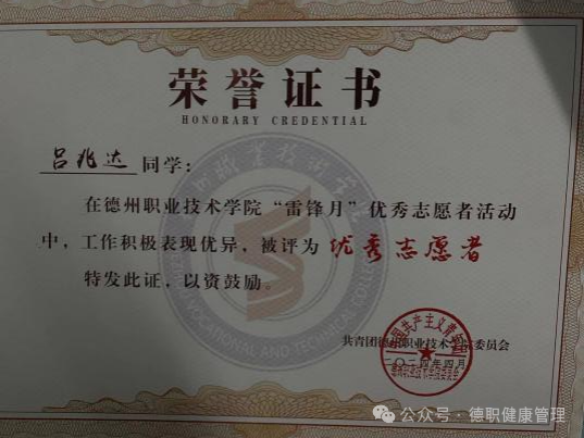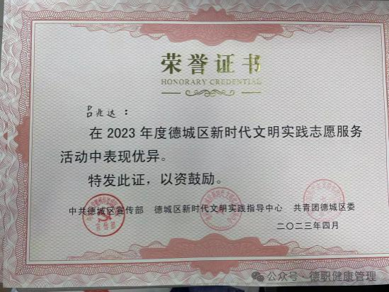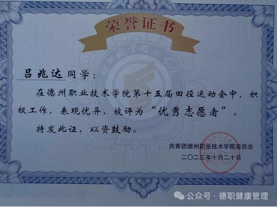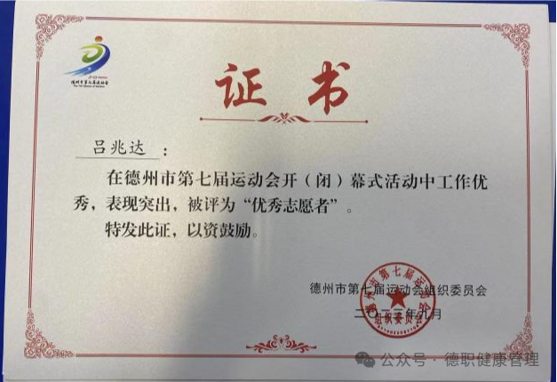 2023年9月,在德州市第七届运动会开(闭)幕式活动中,被评为“优秀志愿者”;