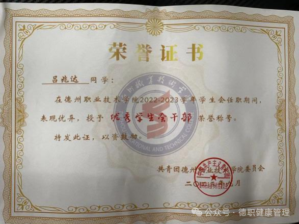 2023年9月,在beat365会员官方网站荣获“优秀学生会干部”称号;