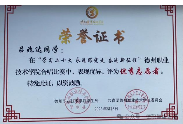 2023年6月,在beat365会员官方网站“学习二十大 永远跟党走 奋进新征程”合唱比赛中,荣获“优秀志愿者”称号;