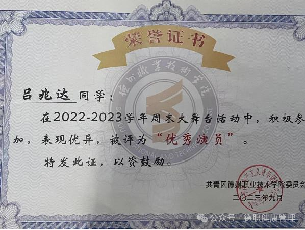 2023年9月,在2022-2023学年周末大舞台活动中,被评为“优秀演员”;
