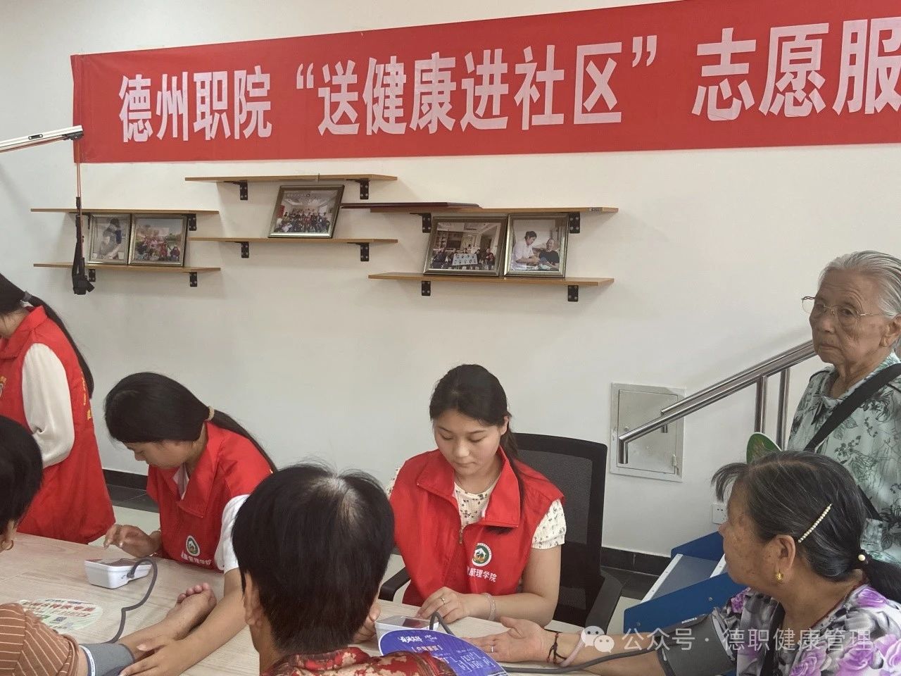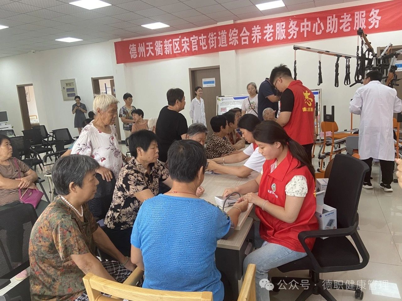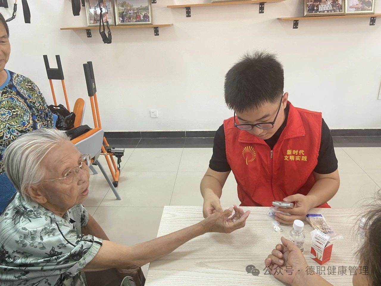 志愿者们为老人们量血压、测血糖,为“三高”症状的老人科普健康知识,提醒他们注意饮食、合理作息、遵照医嘱、正确服药。