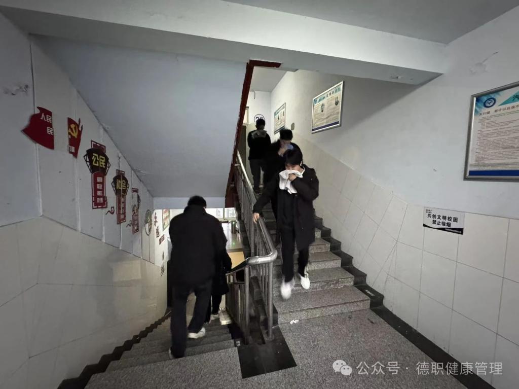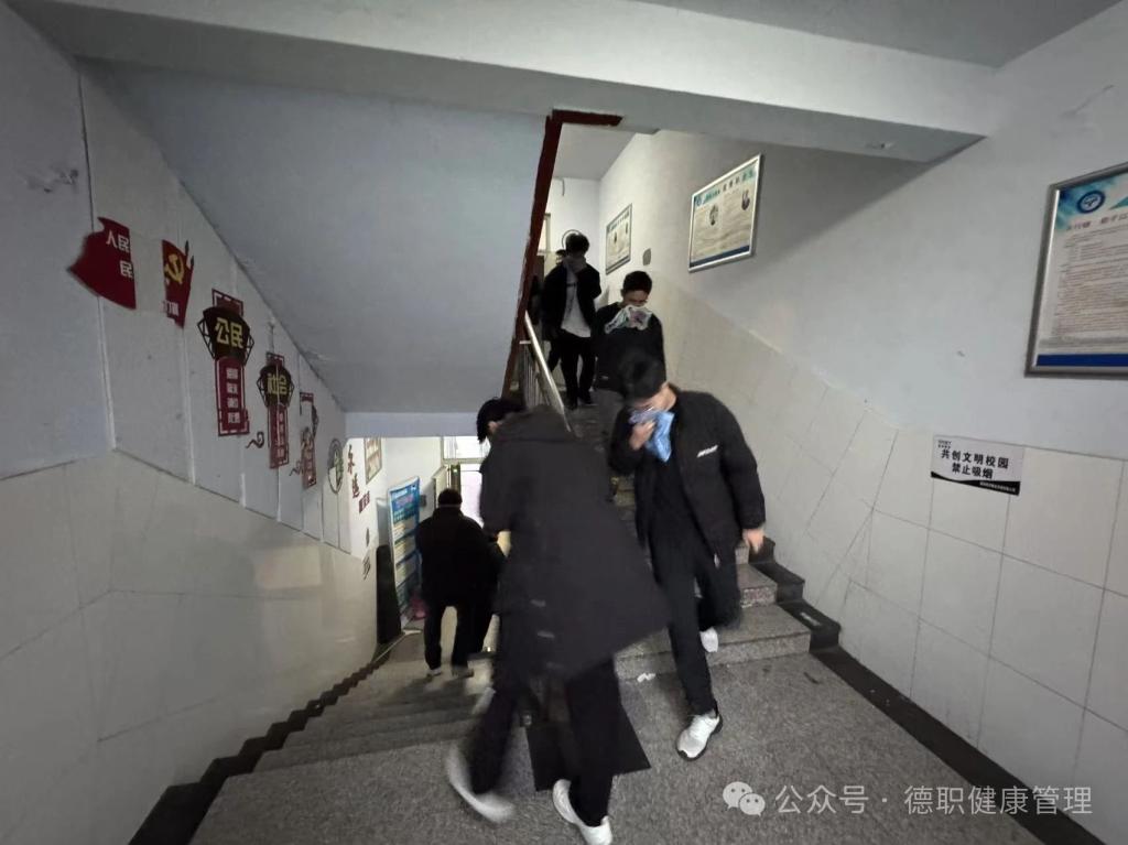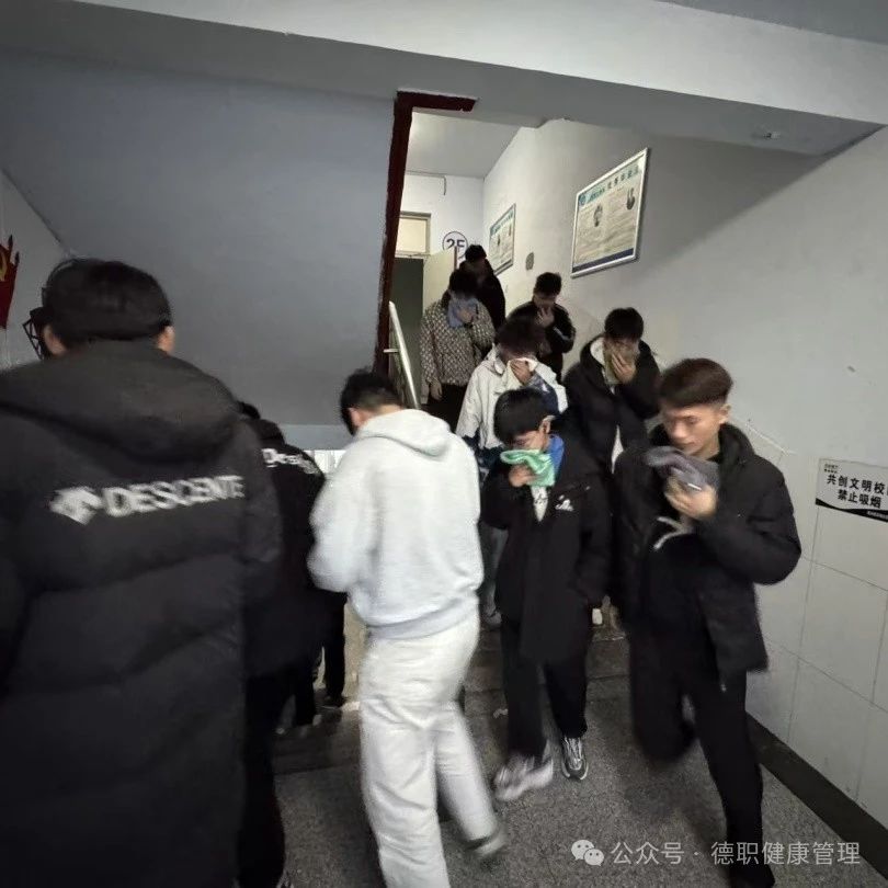 随着急促的警报声响起,同学们迅速进入应急状态,根据“避开火源,就近疏散,统一组织,有条不紊”的疏散原则,按照预定的疏散路线,捂住口鼻,弯腰下楼,快速有序地撤离宿舍楼,向安全区域集合。