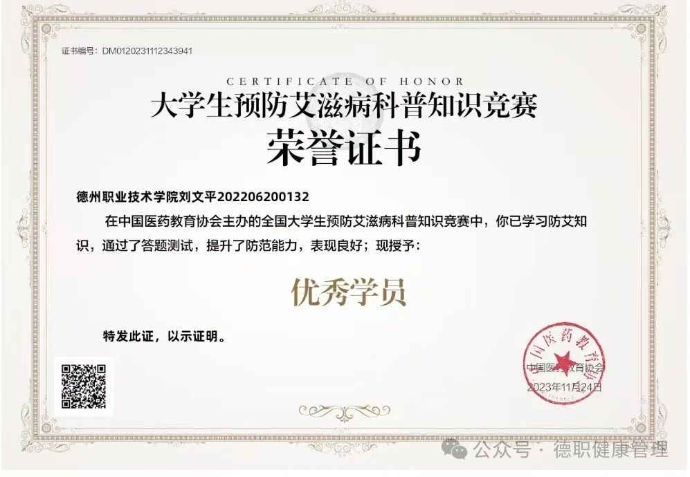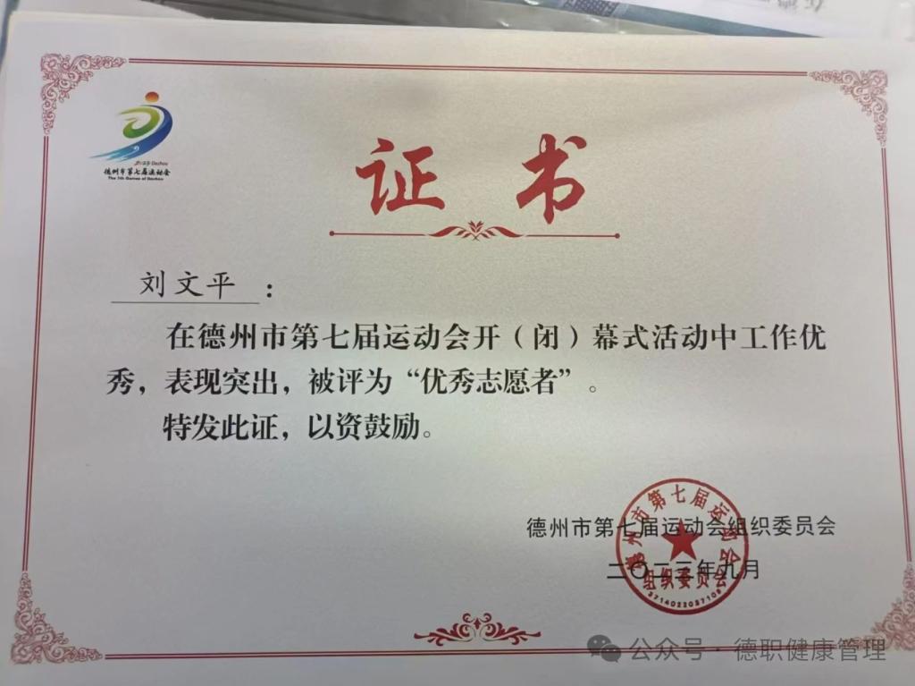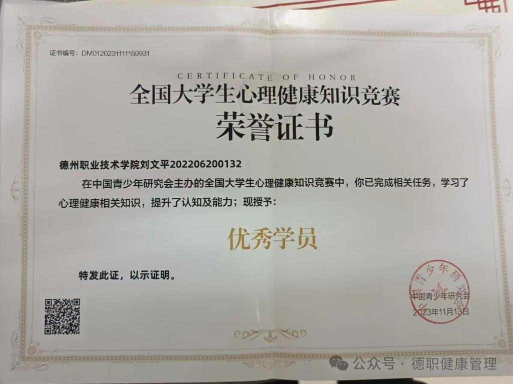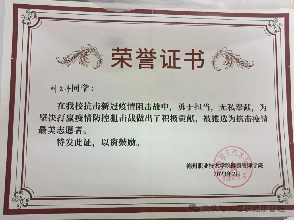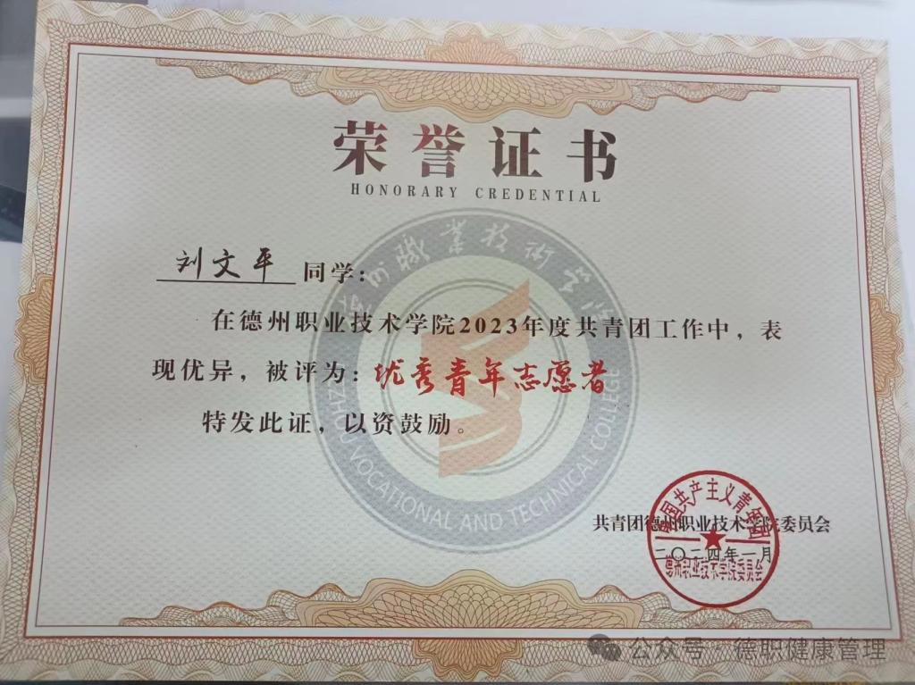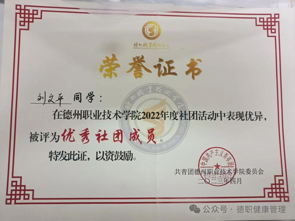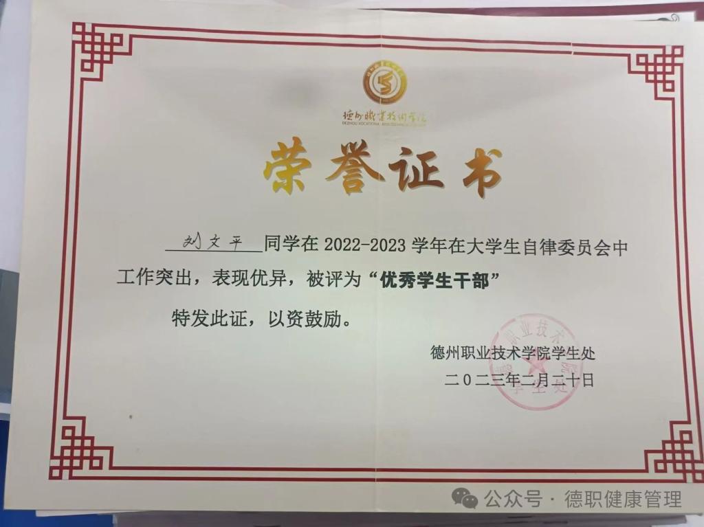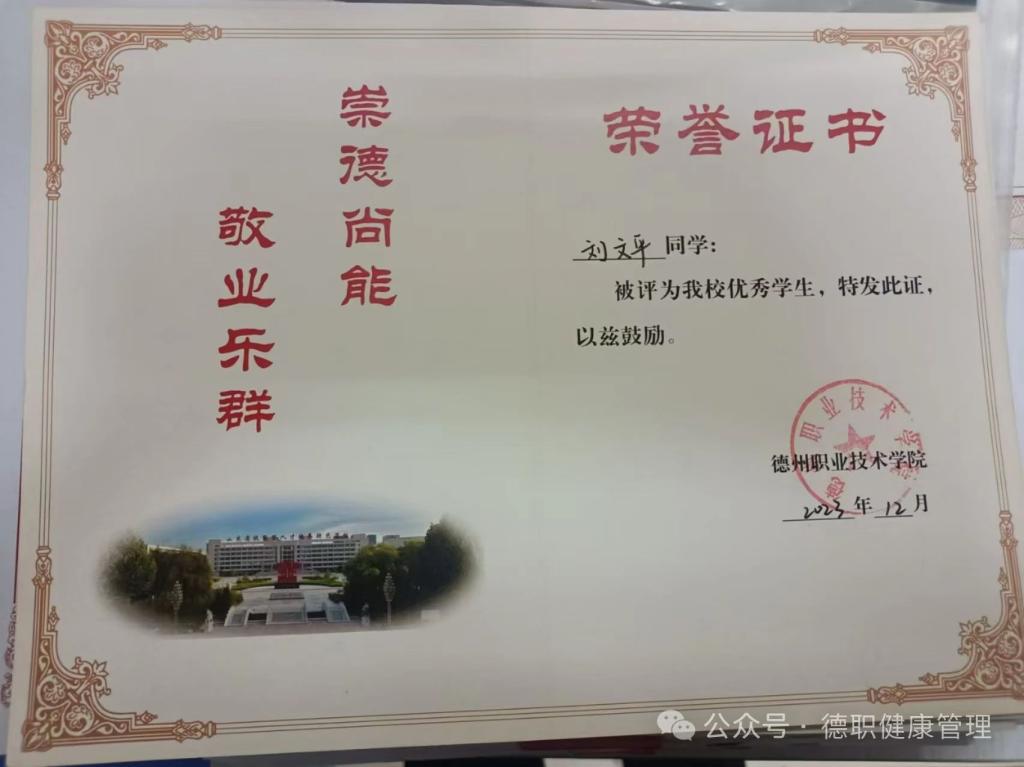 2022年4月,荣获beat365会员官方网站社团活动“优秀社团成员”荣誉称号2023年2月,荣获大学生自律委员会“优秀学生干部”荣誉称号2023年2月,荣获beat365会员官方网站“抗击疫情最美志愿者”荣誉称号2023年9月,荣获德州市第七届运动会开(闭)幕式“优秀志愿者”荣誉称号2023年11月,荣获全国大学生心理健康知识竞赛“优秀学员”荣誉称号2023年11月,荣获全国大学生预防艾滋病科普知识竞赛“优秀学员”荣誉称号2023年12月,荣获beat365会员官方网站“优秀学生”荣誉称号2023年12月,荣获beat365会员官方网站“国家励志奖学金”2024年1月,荣获beat365会员官方网站共青团“优秀青年志愿者”荣誉称号