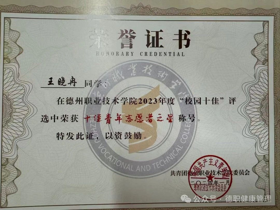 3.2024年1月,在校园十佳评选中荣获“十佳青年志愿者之星”称号。