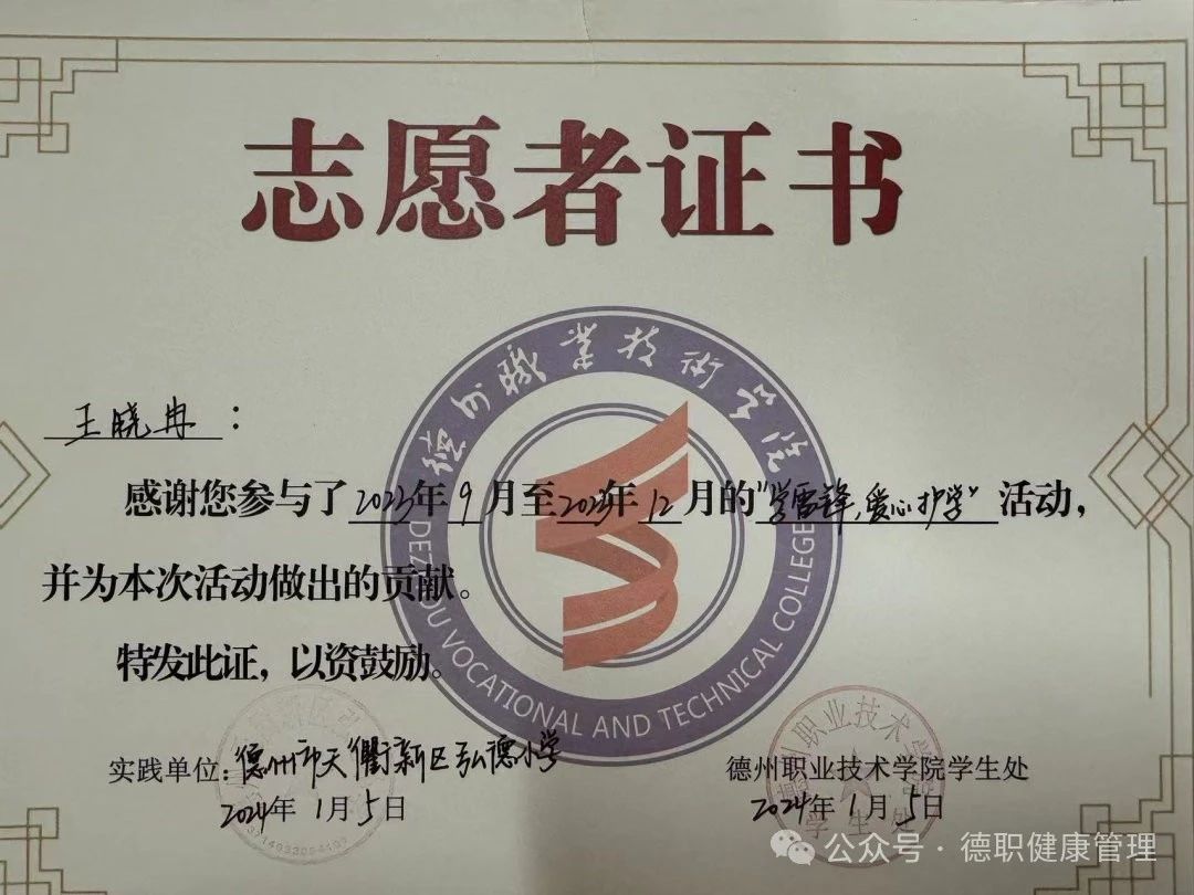 1.2023年12月,在弘德小学“学雷锋爱心护学”志愿服务活动中,表现优异,被授予“优秀志愿者称号”。