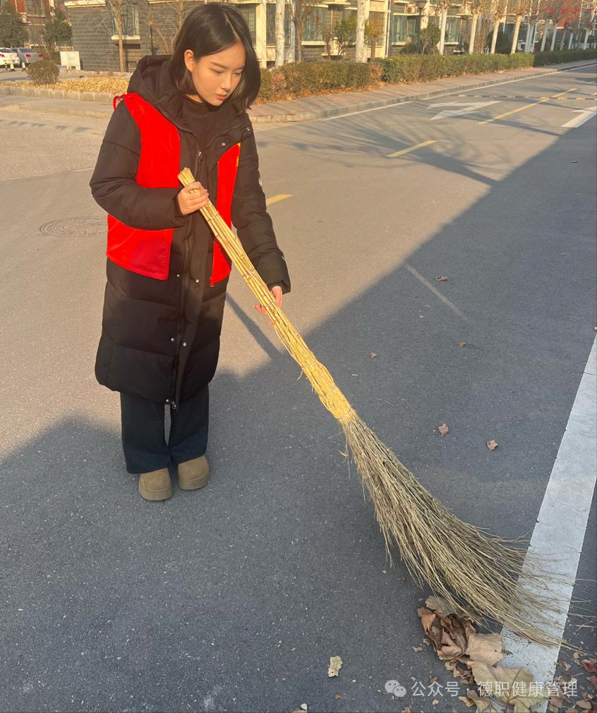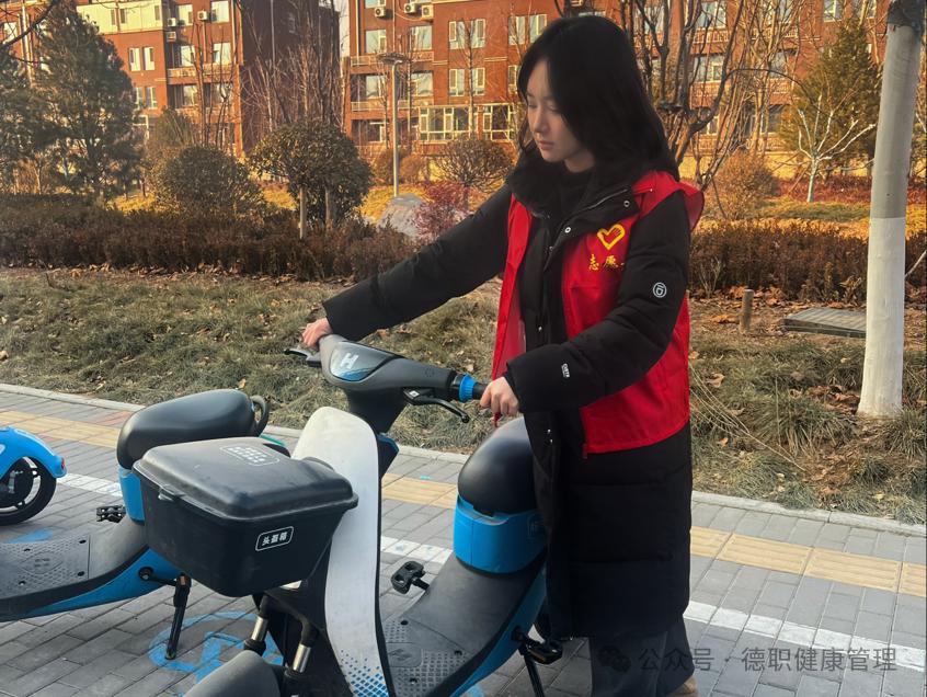 23智慧健康养老服务与管理一班的郝于涵同学,参与社区组织的志愿活动,负责清扫社区垃圾并整理违规停放的共享单车,通过实际行动践行厚德仁爱的传统美德。