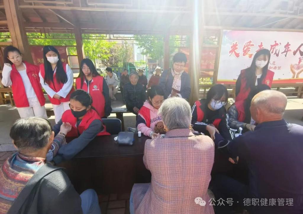活动现场金晖健康社会实践团队的同学们为社区的老人们提供了专业的健康检查,每一位志愿者都耐心细致地为每一位老人测量血糖、血压,并为他们普及健康管理知识。
