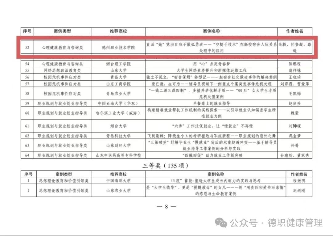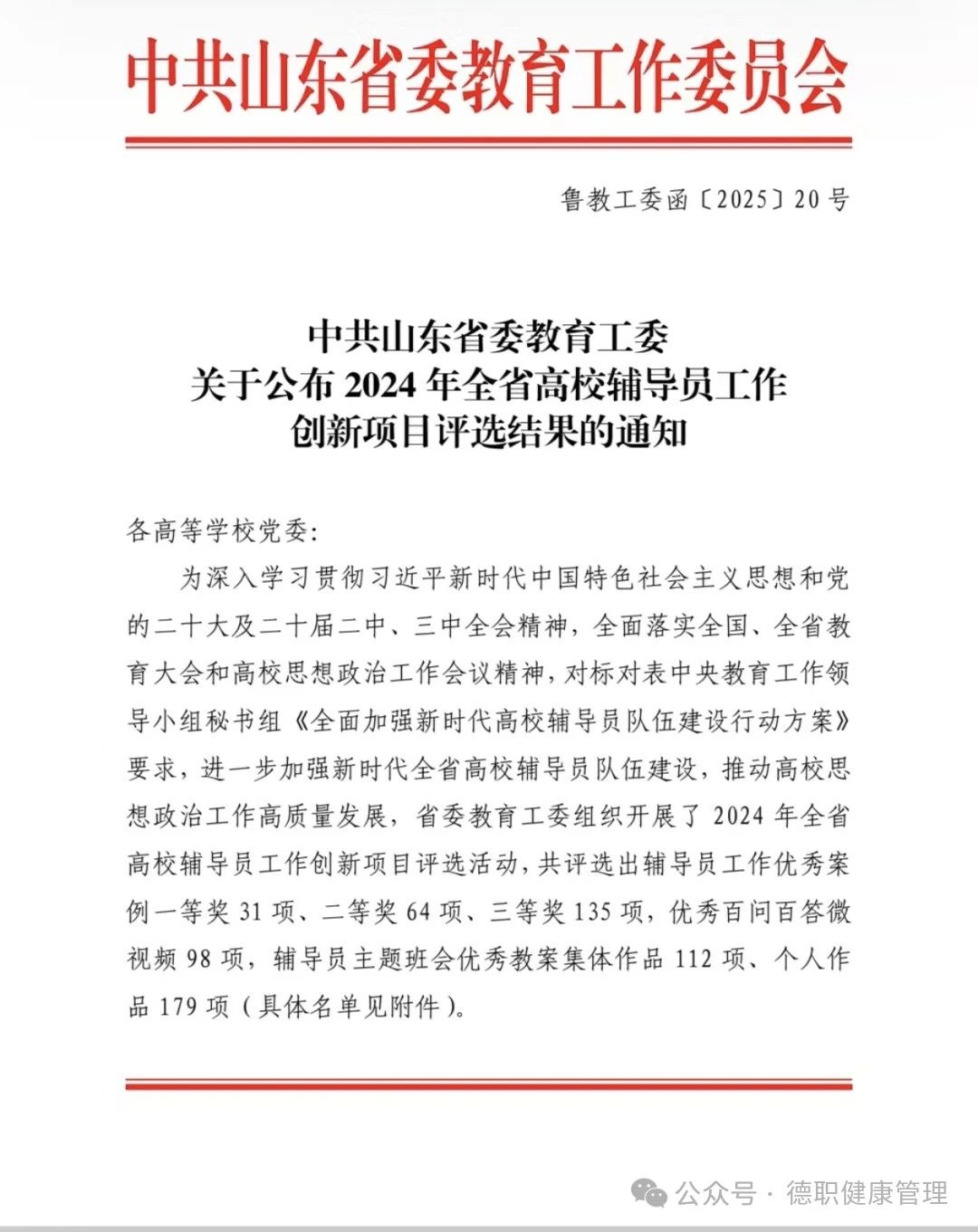 近日,中共山东省委教育工委发布2024年度全省高校辅导员创新项目评选结果,beat365官网"护航成长"辅导员工作室范轶、闫鲁超、路遥三位教师联合申报的《直面"她"觉动自我不做孤勇者——"空椅子技术"在高校宿舍人际关系处理中的创新实践》案例,在全省百余项申报案例中脱颖而出,成功斩获辅导员工作创新案例二等奖!