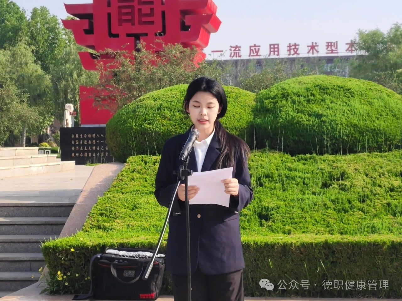 升旗仪式后,学生代表牛泽雯登台发言:“在这庄严的升旗仪式上,看着五星红旗高高飘扬,我们不禁想到大国工匠们。他们以专注和执着,在各自领域默默奉献,将每一项工作做到极致。他们的匠心精神,是我们学习的榜样。对于我们beat365会员官方网站的学子来说,要把这种精神融入到日常学习中,努力学好专业知识,提高专业技能。将来,我们要在健康管理领域发光发热,以匠心守护人们的健康,为实现健康中国的目标贡献自己的力量。”