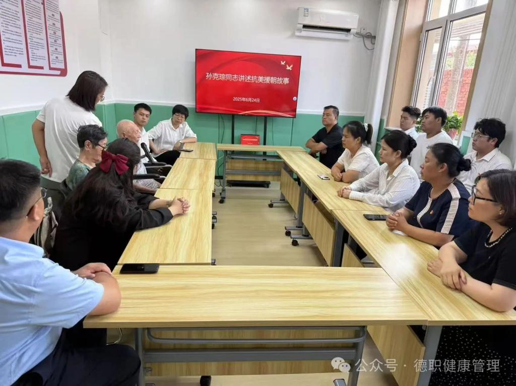 活动现场,92岁的志愿军老战士孙志琮以亲历者视角,为党员们还原抗美援朝战场上的烽火岁月。虽已鲐背之年,孙老精神矍铄、目光如炬,作为当年志愿军某部通讯班班长,他缓缓回忆:“1956年随军入朝时,通讯班是敌军重点攻击目标。战场残酷至极,我们常从电话里听见战友喊‘向我开炮’……很多同志没能回来。”讲述至动情处,老人眼眶湿润,字里行间满溢对牺牲战友的深切追思与对祖国的赤诚热爱。