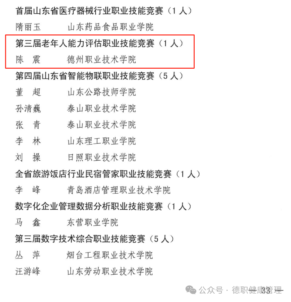陈震老师参加了2024年山东省“技能兴鲁”职业技能大赛——第三届老年人能力评估职业技能竞赛职工组的比赛。此次竞赛分初赛、复赛两个环节。初赛时,陈震老师沉着应对、熟练操作,圆满完成理论考试和技能实操项目,并顺利进入决赛。决赛现场竞争激烈,陈震老师凭借过硬的专业知识,按照老年人能力评估师(三级)的国家职业标准及老年人能力评估规范中的要求细致地完成比赛操作项目,荣获该项比赛一等奖第1名的好成绩,山东省人力资源和社会保障厅授予陈震老师“山东省技术能手”荣誉称号。
