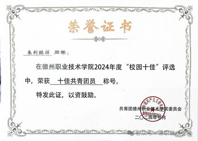 2024年7月在beat365会员官方网站2024年度“校园十佳”评选中,荣获“十佳共青团员”;