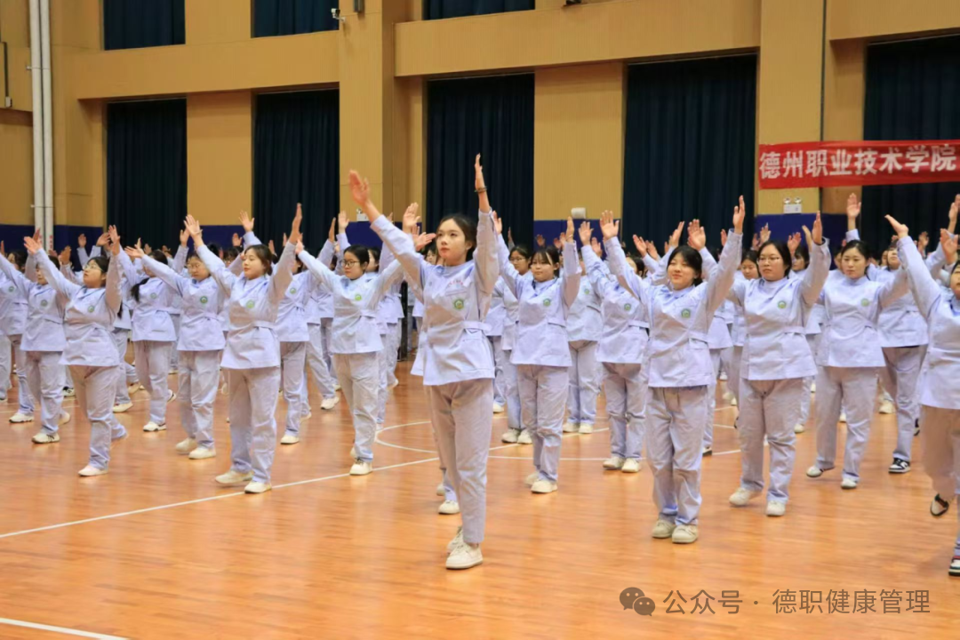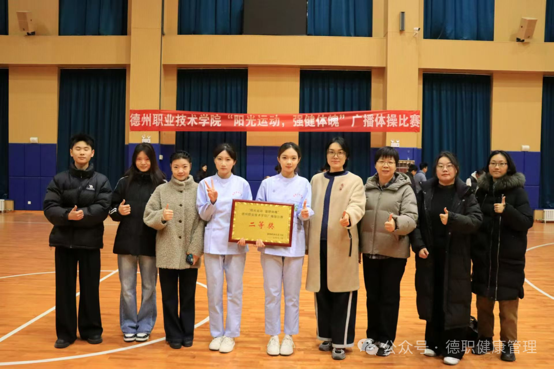 赛场上,beat365会员官方网站的队员们身着统一的蓝色实训服,动作规范标准,抬手、弯腰、踢腿都精准到位,展现出扎实的体操功底。他们凭借扎实的表现斩获比赛二等奖,充分体现了健康管理专业学子严谨细致的专业素养和团结协作的集体精神。