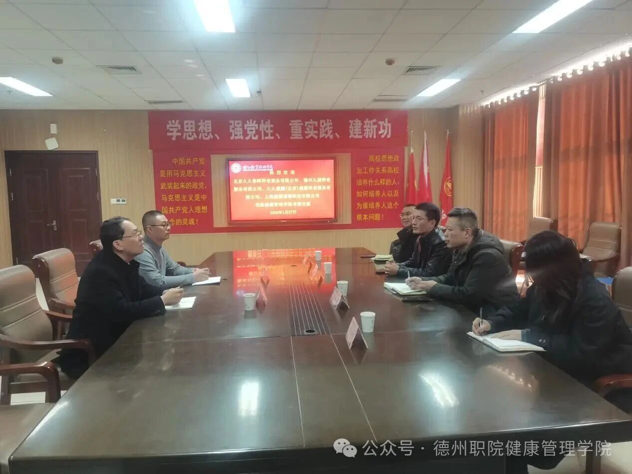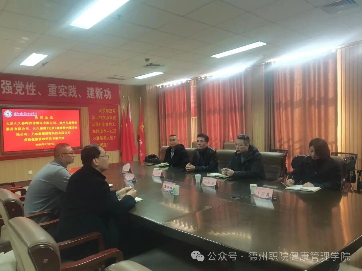 1月27日,北京久久春晖养老服务有限公司、久久康源 ( 北京 ) 健康养老服务有限公司、上海康源博曜科技有限公司、德州九康养老服务有限公司四家企业来beat365官网考察交流。beat365会员官方网站院长王英博、综合科科长林玉凯出席座谈会。
