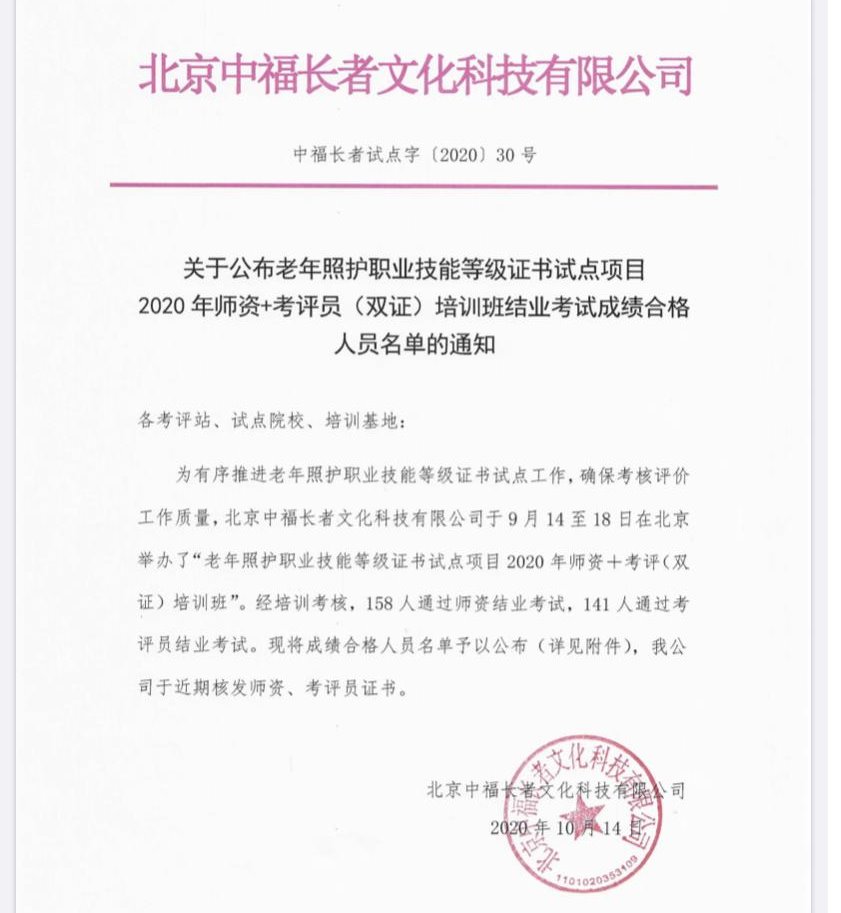 913—18日,beat365会员官方网站四名教师参加了由中国社会福利与养老服务协会、北京中福长者文化科技有限公司举办的“教育部1X老年照护职业技能等级证书试点项目2020年师资+考评员(双证)培训班”。培训过程中老师们认真准备,经过紧张激烈的角逐,范轶、齐宁、刘玉华、祁首鸣四位老师通过考试,获得了“师资+考评员”双资格,为beat365官网老年健康管理专业深化教育教学改革、优化课程体系,加强复合型技术技能人才培养等方面做好知识储备,同时进一步加强校企合作,培养更多贴近企业实际需求的技能人才,更好地促进学生就业。