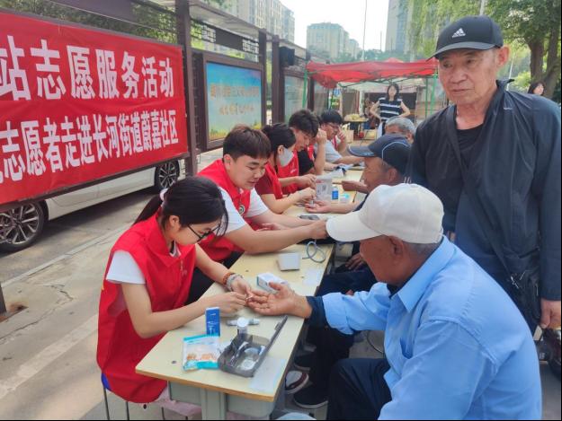 学生志愿者们为社区老人们测血压、测血糖,耐心与老人们交流,并向他们讲解健康保健知识。针对出现“三高”症状的居民给予注意饮食、合理作息、遵照医嘱,正确服药的提醒。