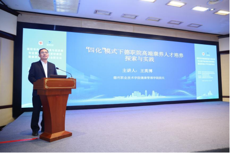 院校交流单元,王英博以《“四化” 模式下德职院高端康养人才培养探索与实践》为题作报告。他指出,当前健康中国战略深入推进,人口老龄化加剧催生了康养产业的爆发式增长,但 “留不住、用不上、干不好” 的人才困境正严重制约产业高质量发展。作为省级职业教育龙头院校,德州职院主动锚定产业核心需求,创新构建 “体系化筑基、精细化提质、数字化赋能、品牌化突围” 的育人模式,相关探索与实践成效显著。