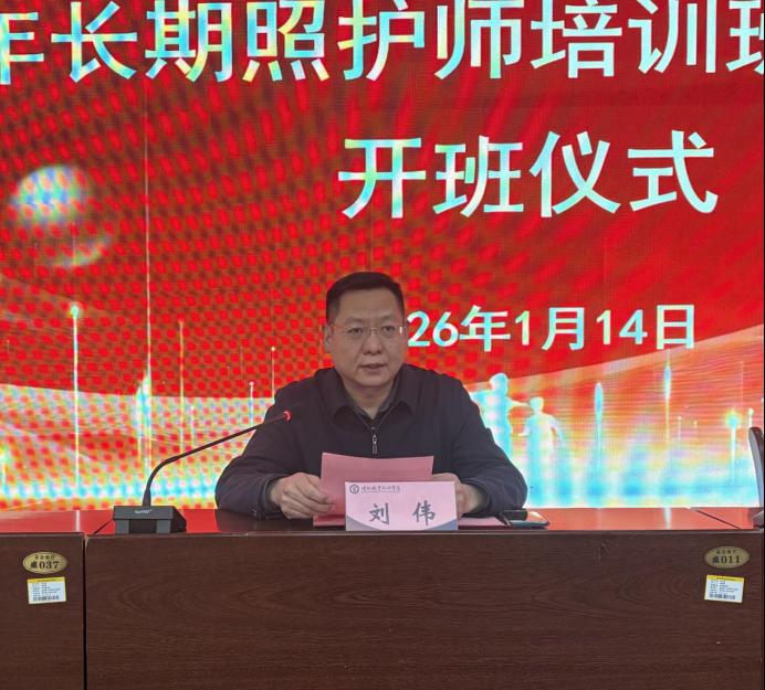 1月14日,德州市2026年长期照护师培训班在beat365官网开班。校党委委员、工会主席刘伟,德州市医疗保障局党组成员、待遇保障科科长冯玉梅,德州市医疗保障局医保中心长期护理保险科科长马慧出席开班仪式。会议由beat365会员官方网站书记范轶主持。