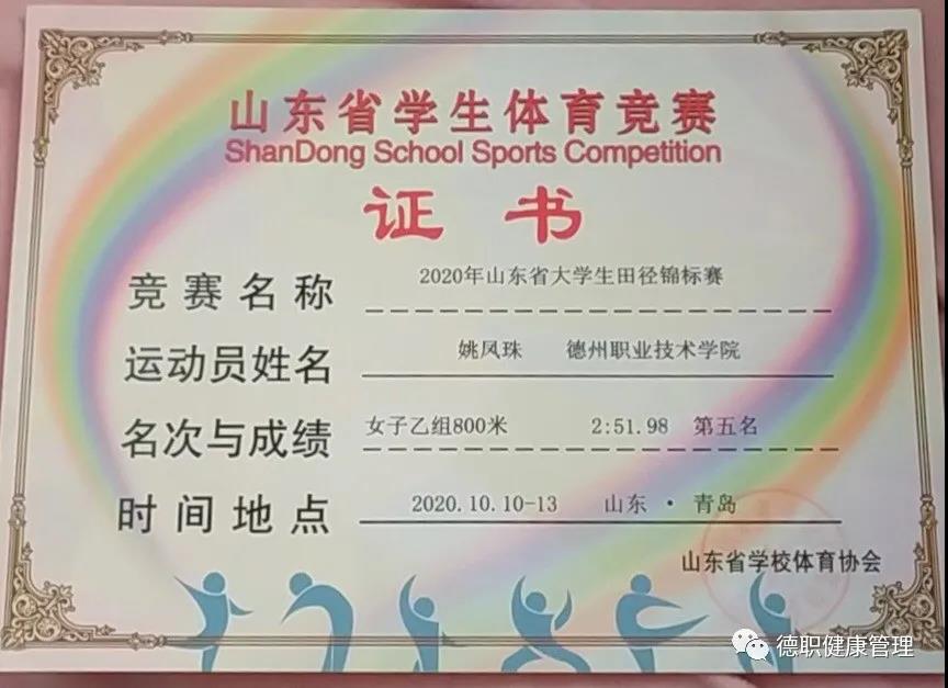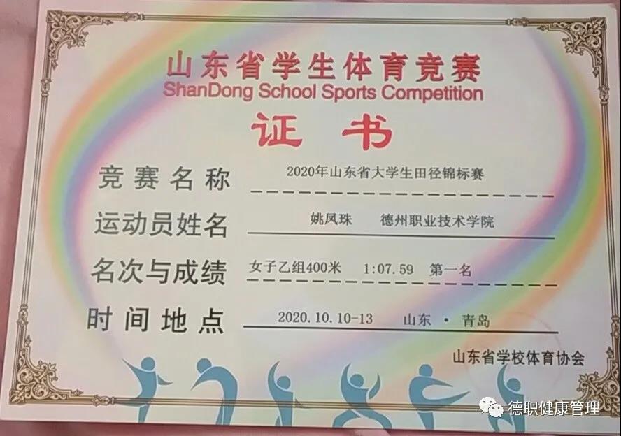 我叫姚凤珠,来自2020级老年服务与管理2班。2020年9月入校后,10月份就代表学校参加了山东省大学生田径锦标赛,并获得了女子400米一等奖、800米二等奖、4