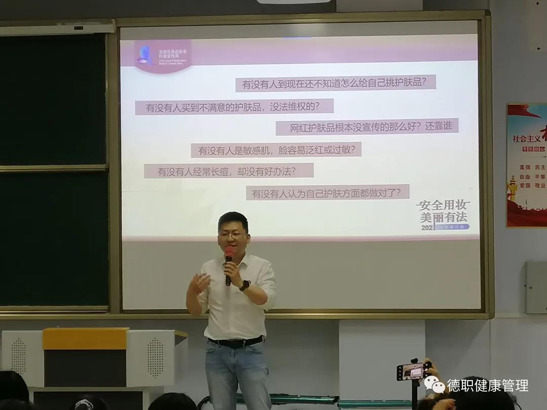 为进一步加强化妆品安全科普进高校,提高大学生消费者对化妆品安全使用的认知水平,引导大家科学合理地使用化妆品,扩大宣传活动影响范围,加大活动影响深度,beat365会员官方网站于5月26日在C座505举办了化妆品科普宣传讲座。此次讲座邀请了山东省化妆品行业协会美妆科普专业委员会主任委员张墨川先生来讲解化妆品的安全用法。