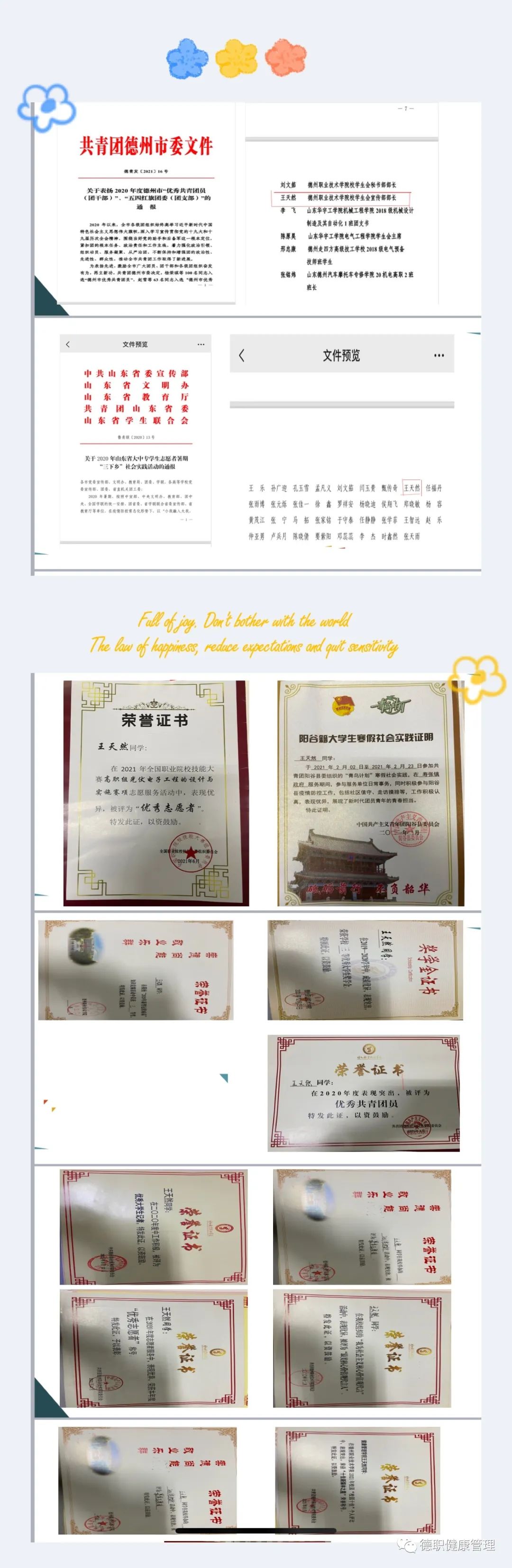 2020.04新型冠状病毒知识竞赛答题三等奖2020.12山东省三下乡优秀志愿者,等。